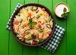 7. Spoon the biryani on to a serving plate, garnish with the reserved onions and chopped coriander and serve hot.