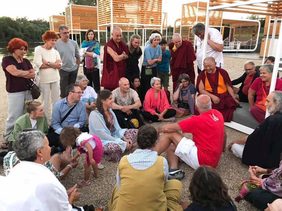 There was daily yoga under the orange trees in the cloisters, and teaching sessions with Lama Tsultrim for those new to dharma, when he explained any missing detail and gave the opportunity for further questions. The warm evenings lent themselves to strolls by the river and an ice cream with Rinpoche, and hallelujah! the unusual absence of mosquitos permitted night time windows to be left open to the moonlight and the sound of crickets calling Tara to the cornfields.